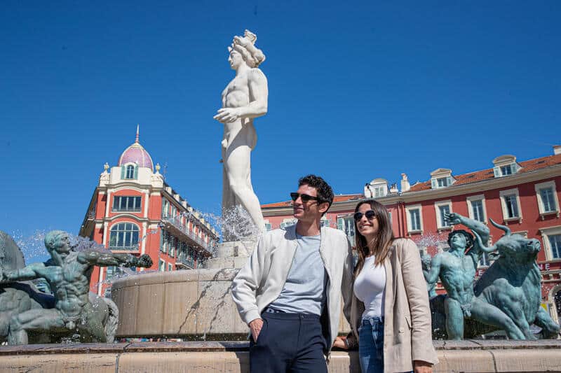 C’est sur les dalles géométriques de la Place Masséna que les candidats d’Offline Love se retrouvent jour après jour, entre rendez-vous discrets et rencontres imprévues. Entourée d’arcades aux allures italiennes, baignée de lumière et rythmée par le passage du tramway, la Place Masséna devient le décor vivant d’instants suspendus.